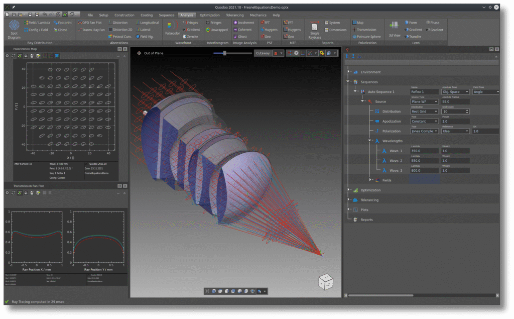 软件具备深层次的物理仿真能力。其偏振光线追迹引擎全面支持双折射材料、定制薄膜镀膜及各类偏振元件,可精确分析菲涅尔损耗、偏振态演变及应力双折射等效应。同时,其波动光学工具箱基于稳健的“光束束传播法”,能够模拟干涉、衍射等波动现象及相干光束传播,适用于激光系统、光纤耦合等领域的精细分析。