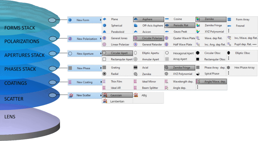 借助独特的“形态堆栈”功能,用户可将几何形状(包括自由曲面与阵列)、相位函数、镀膜特性、偏振属性等任意组合与堆叠,从而创造出几乎无限种类的光学表面,为前沿光学设计提供极大自由度。